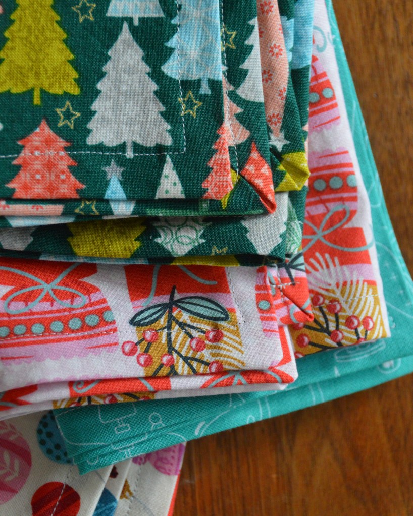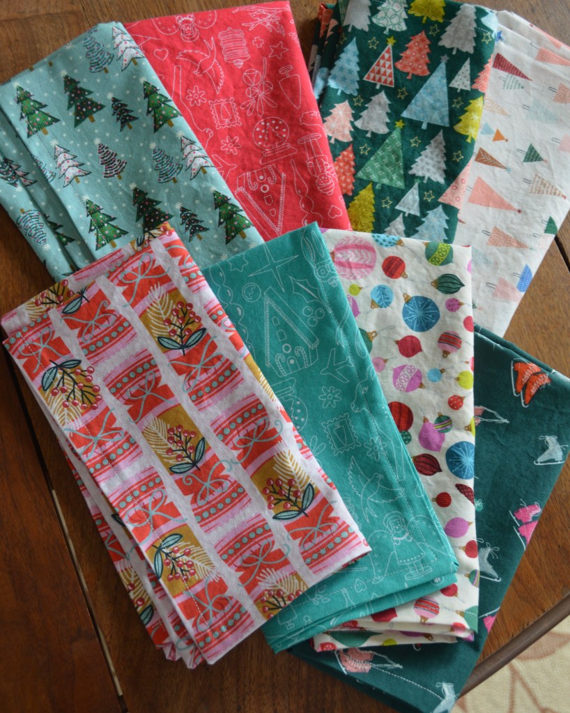 On another holiday front, I decided at the last minute to whip up a new set of napkins for Christmas. I saw this bundle of fat quarters at Sarah’s downtown on Mass street and I jumped on them.